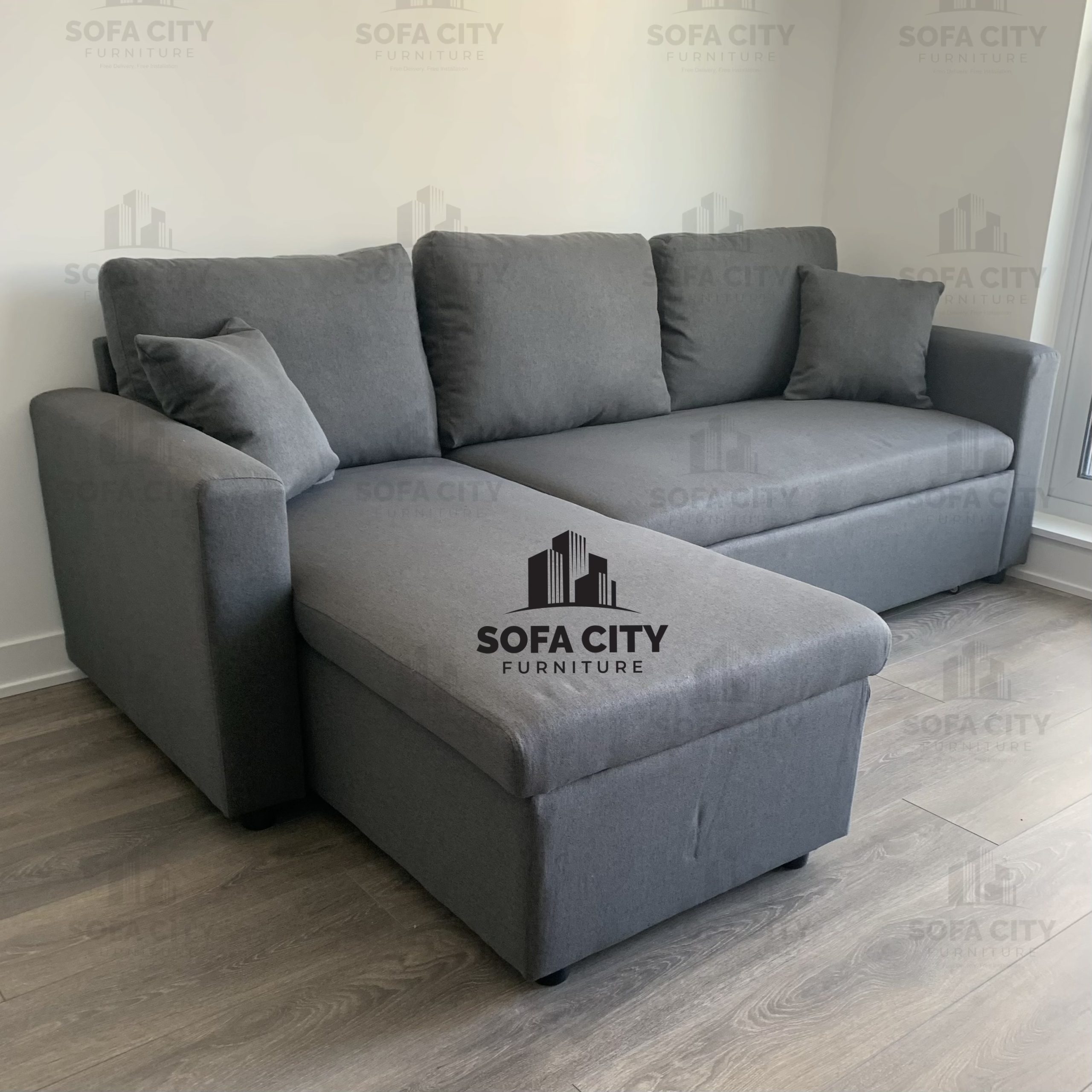 This brand new, reversible pull out bed with storage is a beautiful multifunctional compact addition to any living space. The beautiful fabric, along with its compact design and multiple uses makes it ideal for any layout, and at an affordable price. Please contact for any further questions.