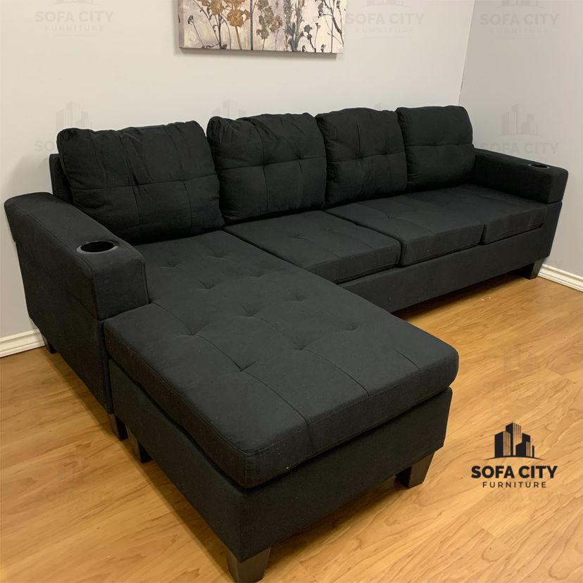 This beautiful black fabric sectional is now available free for delivery and installation. Its reversible capability, and medium size makes it fantastic fit for a variety of spaces. The colour is also wonderful at hiding any stains it may accumulate during its long life. The cupholders are a great modern addition that provides convenience, and style.
