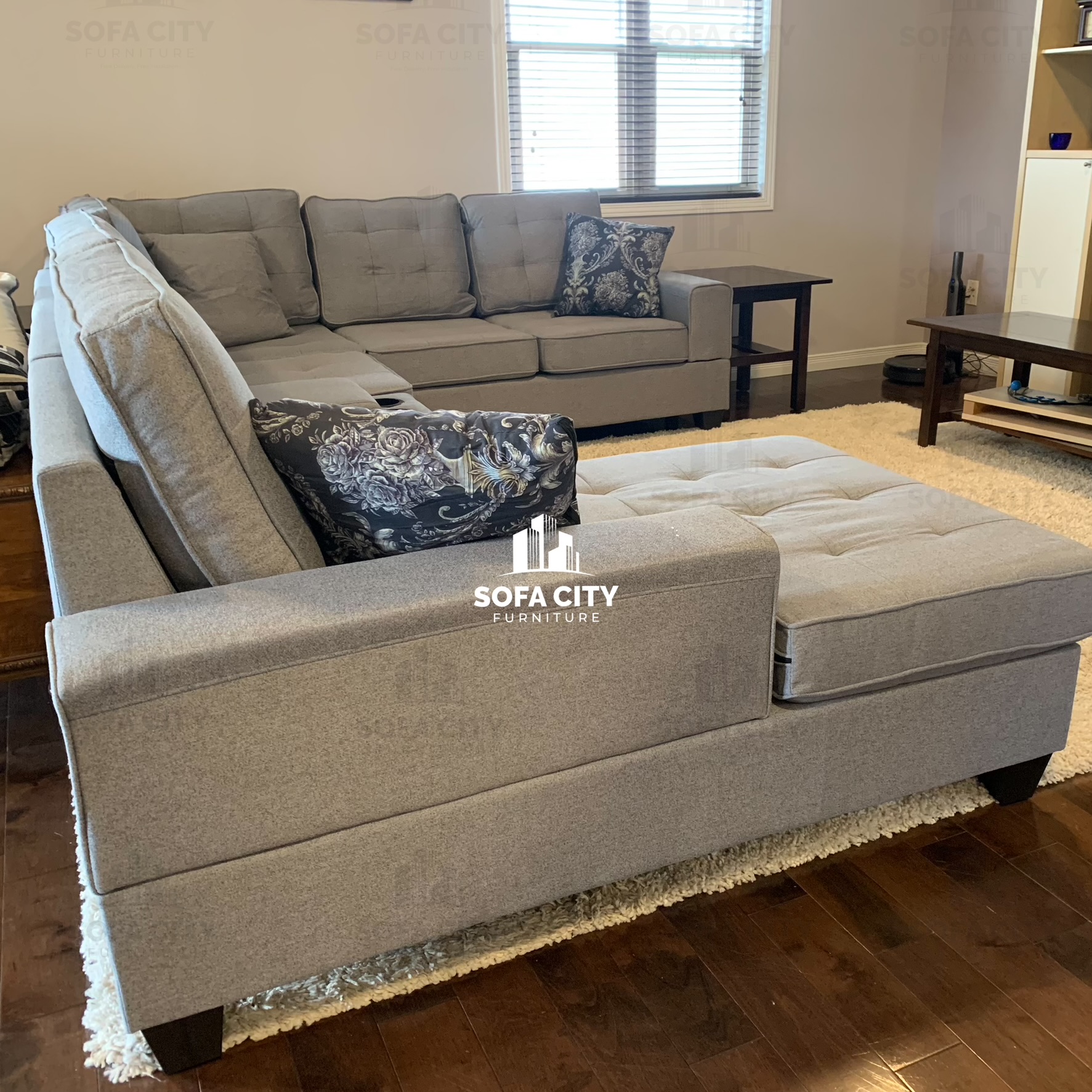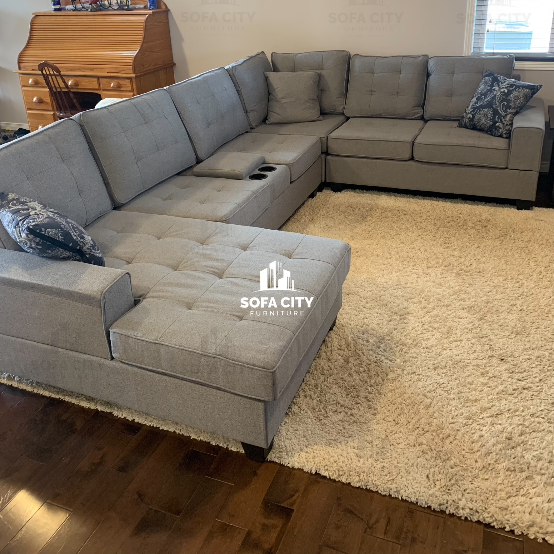 This stunning brand new grey u shaped sectional is a beautifully designed, soft fabric, high density foam model. It’s is an excellent addition to any spacious living room. It also comes with cupholders and a small console for storage. Please contact for more details!