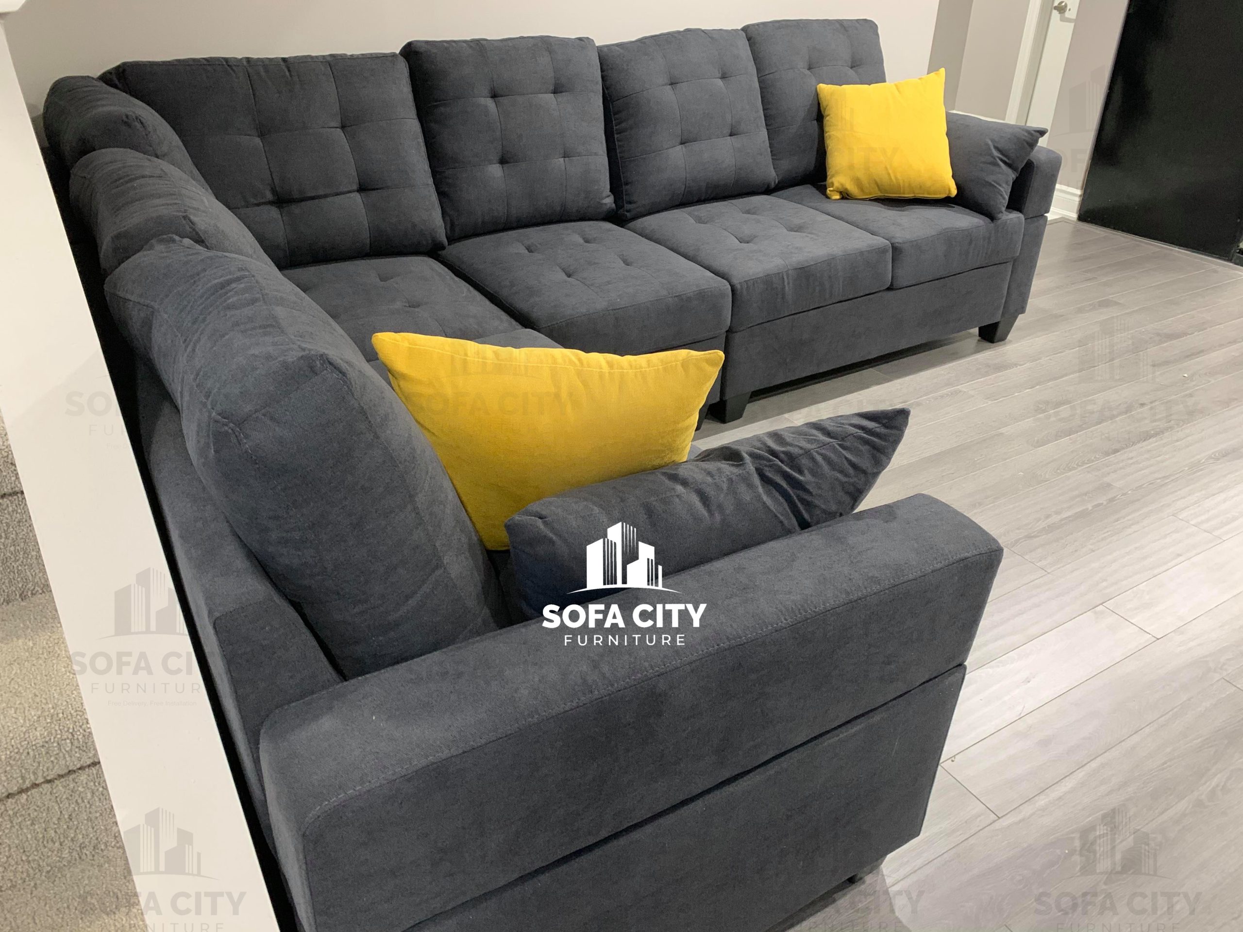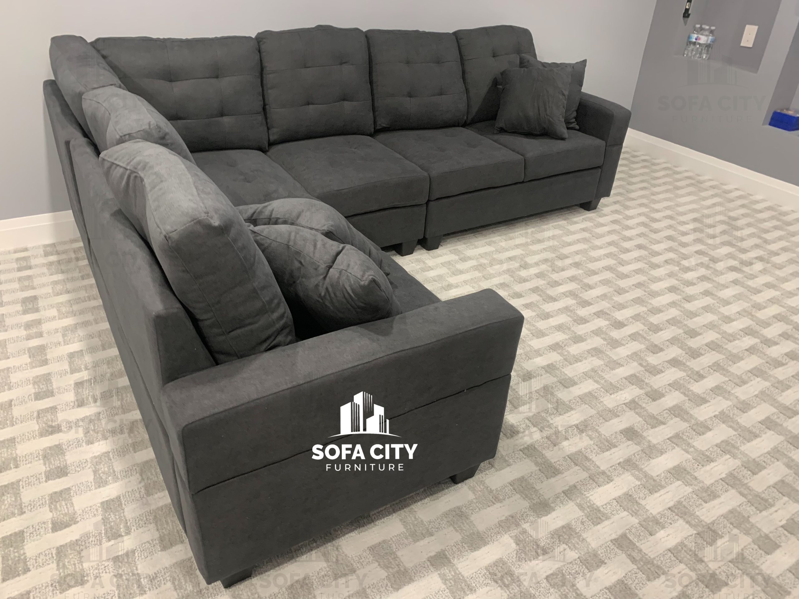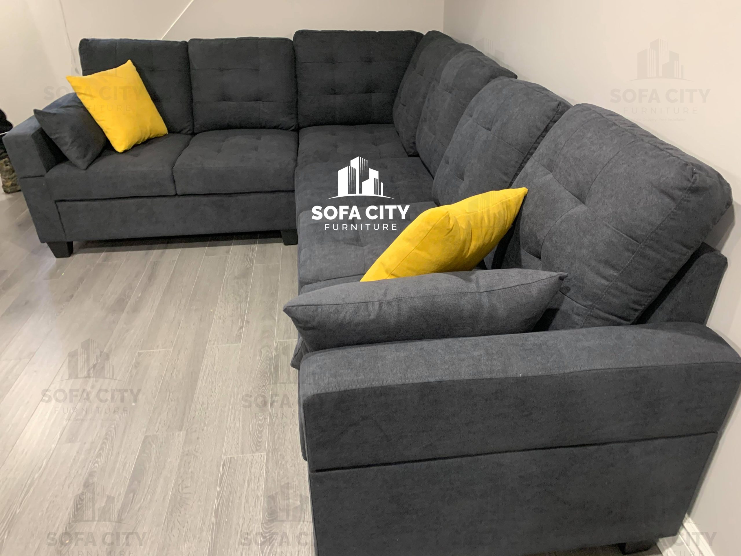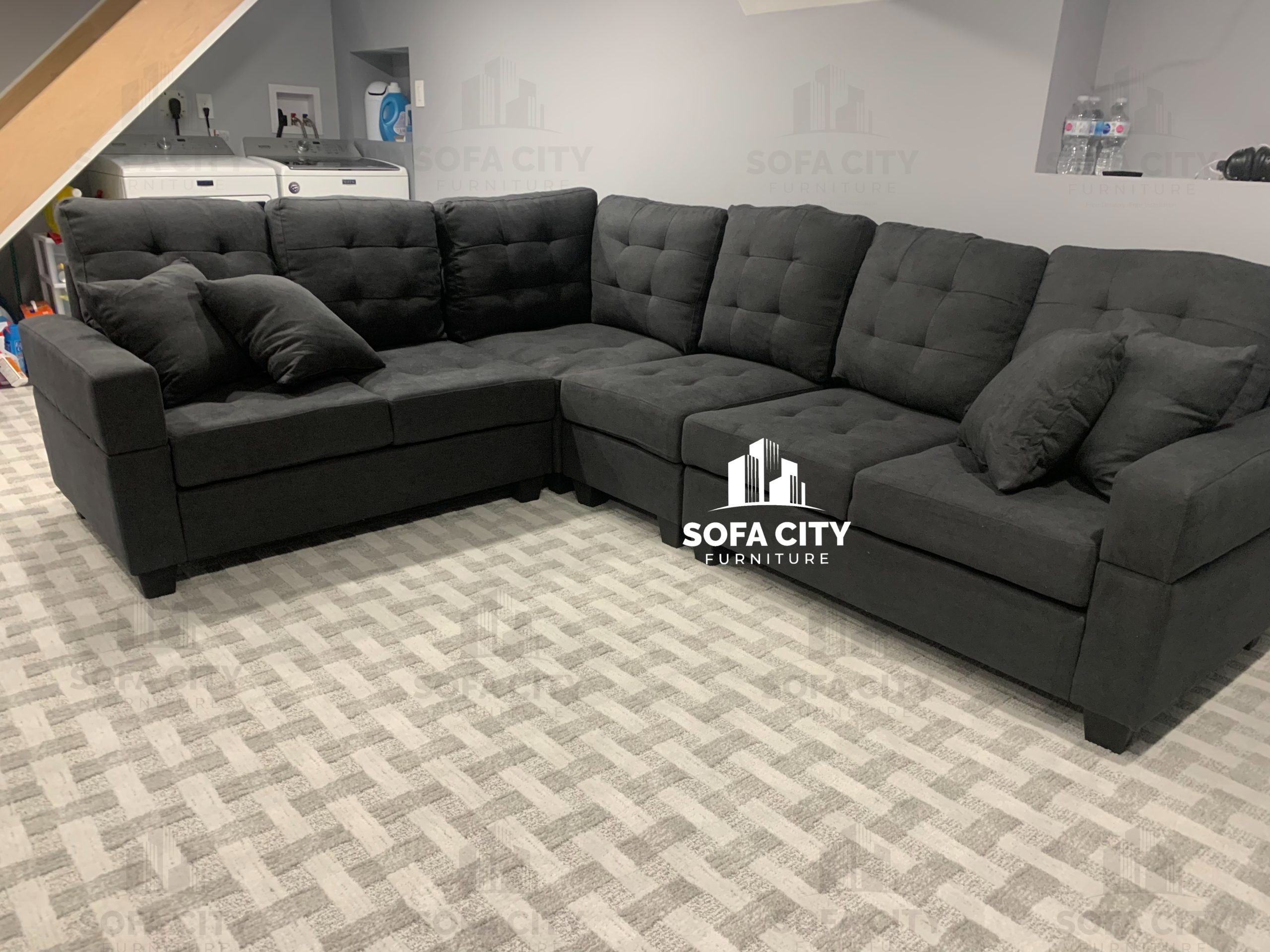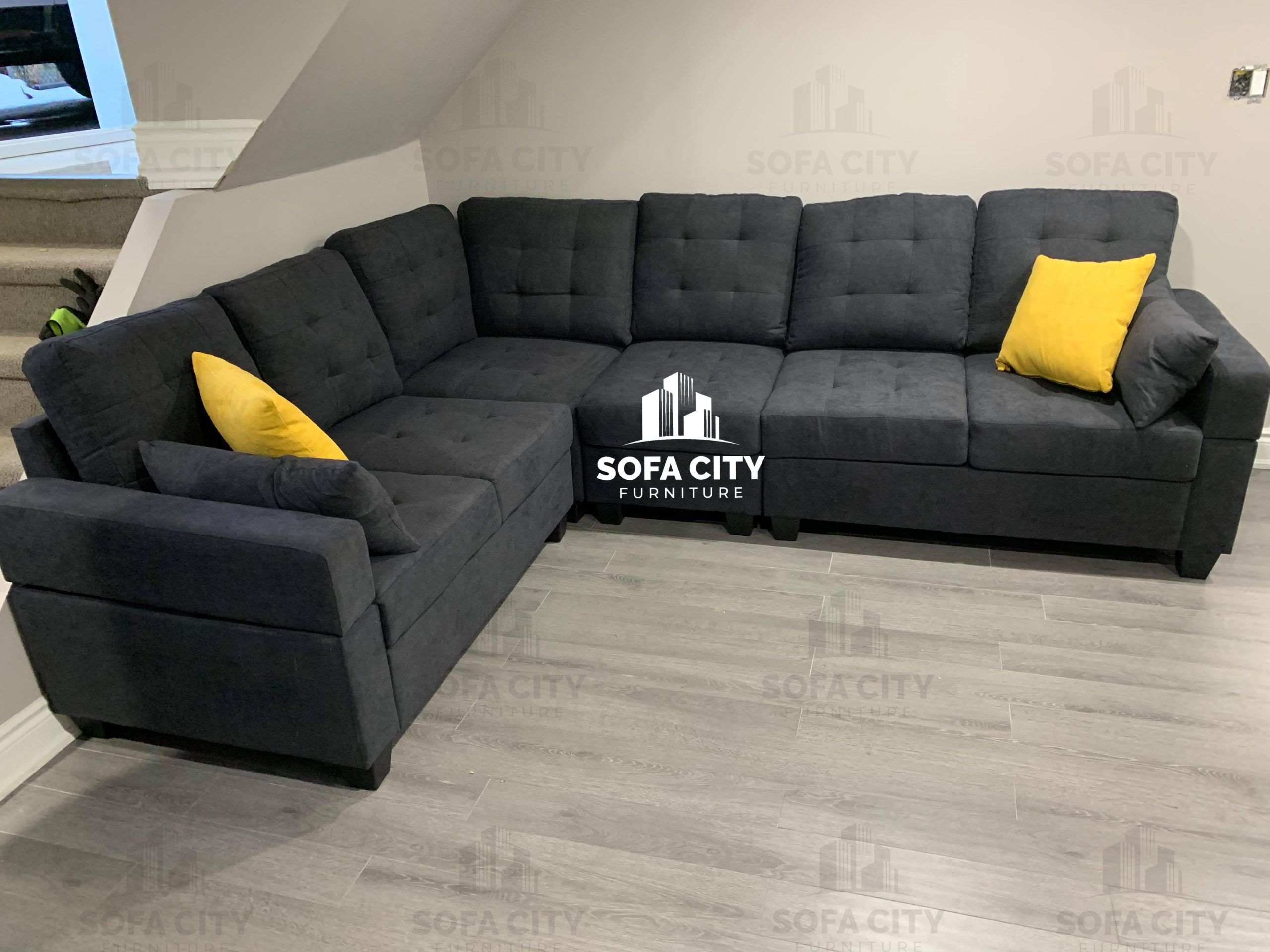 This stunning brand new black sectional is a beautifully designed, soft fabric, high density foam model. Its soft fabric is an excellent addition to its good back support and beautiful style. A small section of the couch can be moved from one side to the other or be removed completely to form a smaller sectional depending on space constraints.