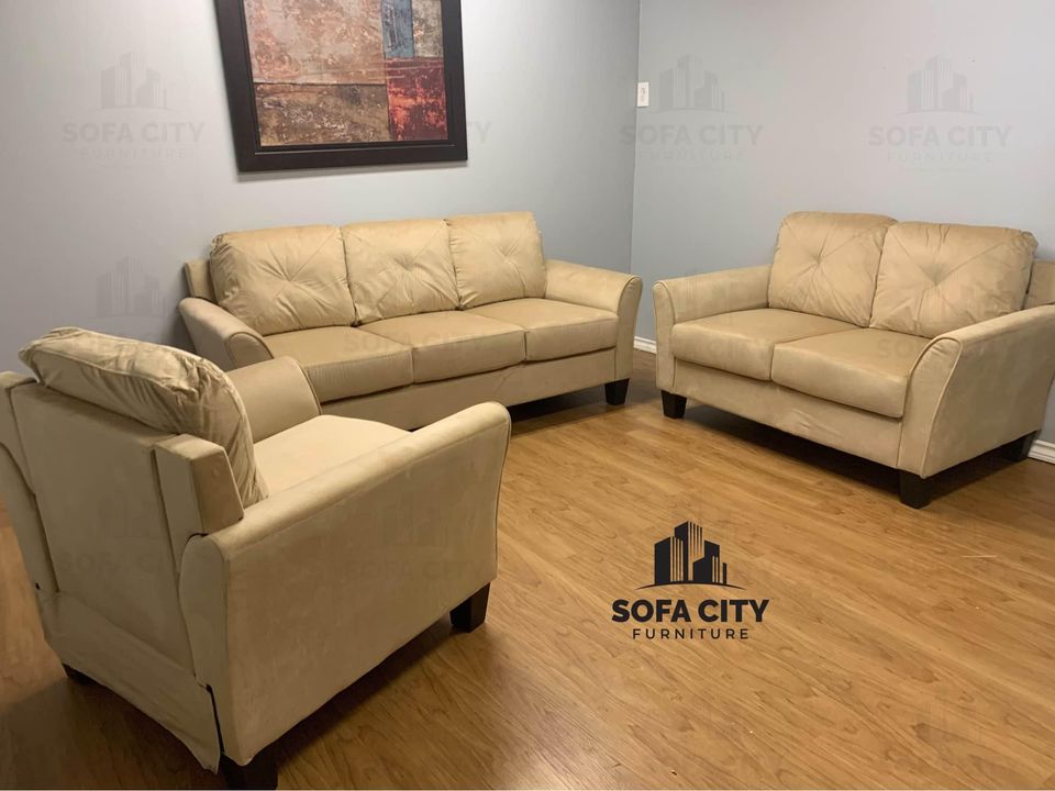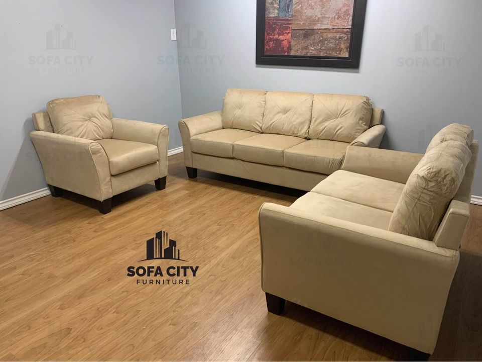 This absolutely stunning caramel coloured velvet 3 piece couch set would make an elegant addition to any living space. It’s sleek design and modern style add a touch of contemporary fashion to the home. Please contact for more details!