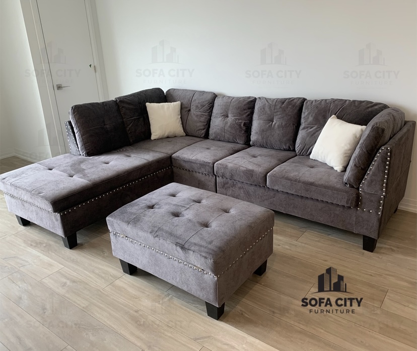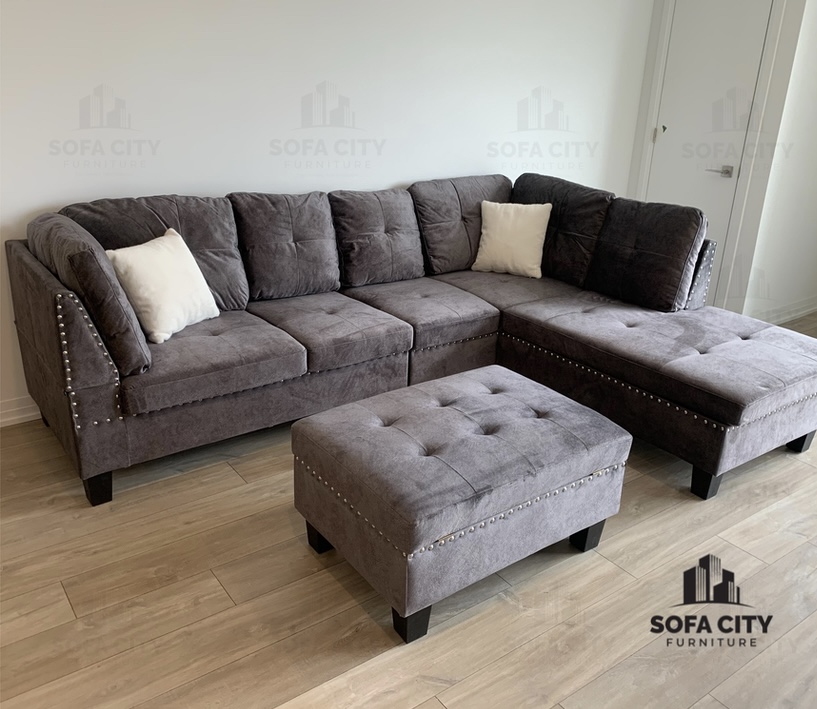This beautifully designed fabric sectional is available for full service delivery and installation in your home free of charge. Extremely soft microfibre material has velvety feel, it’s durable, and holds up well against use. The cushions are made with high density foam for added comfort and the included ottoman comes with easily accessible storage. Please feel free to contact with any questions or details.