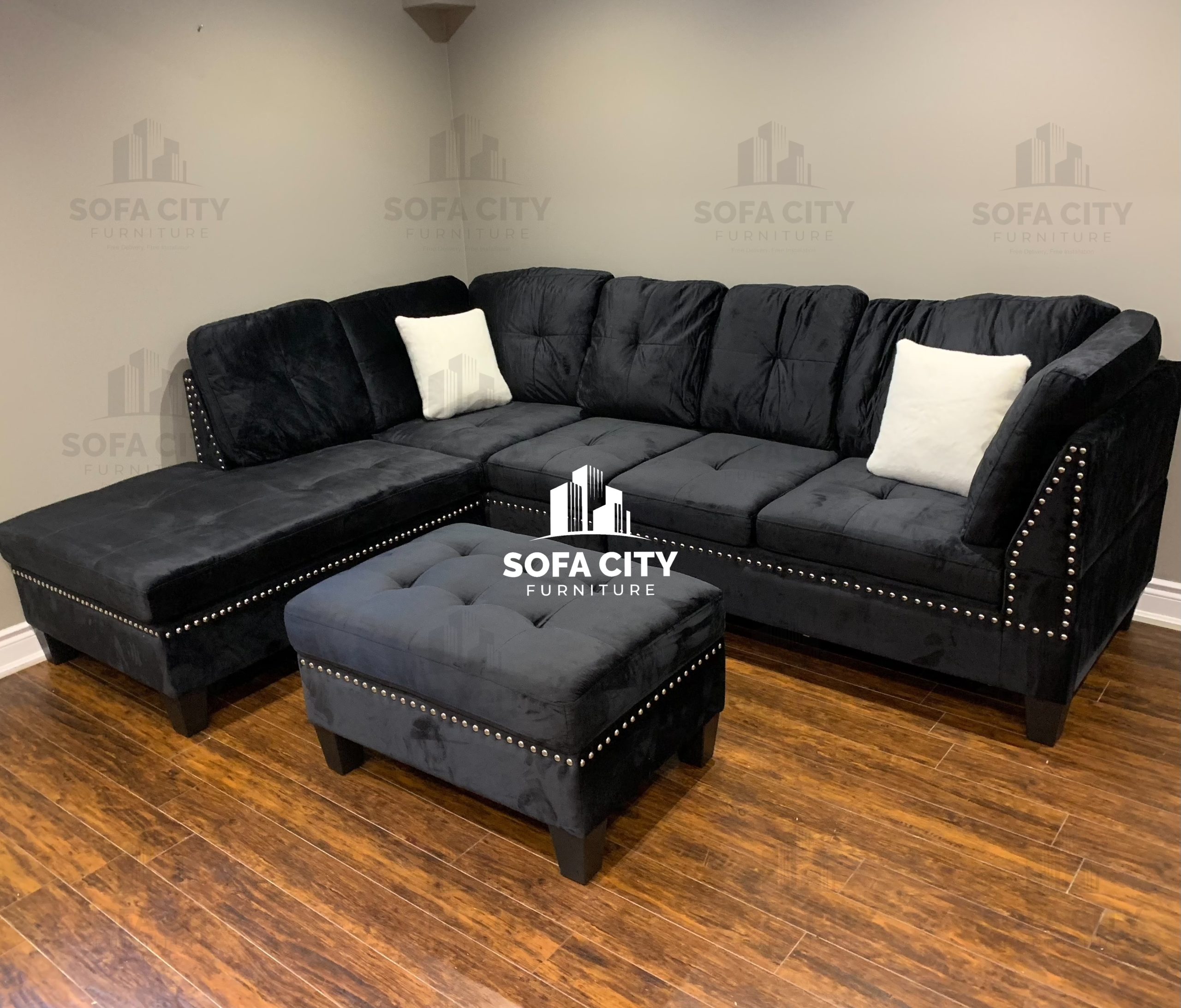This beautifully designed black velvet sectional is available for full service delivery and installation in your home free of charge. The extremely durable material holds up well against use, and definitely adds a luxury feel to the room it is in. The cushions are made with high density foam for added comfort and the included ottoman comes with easily accessible storage. The couch can be a left and right facing sectional(reversible). Please feel free to contact with any questions or details.