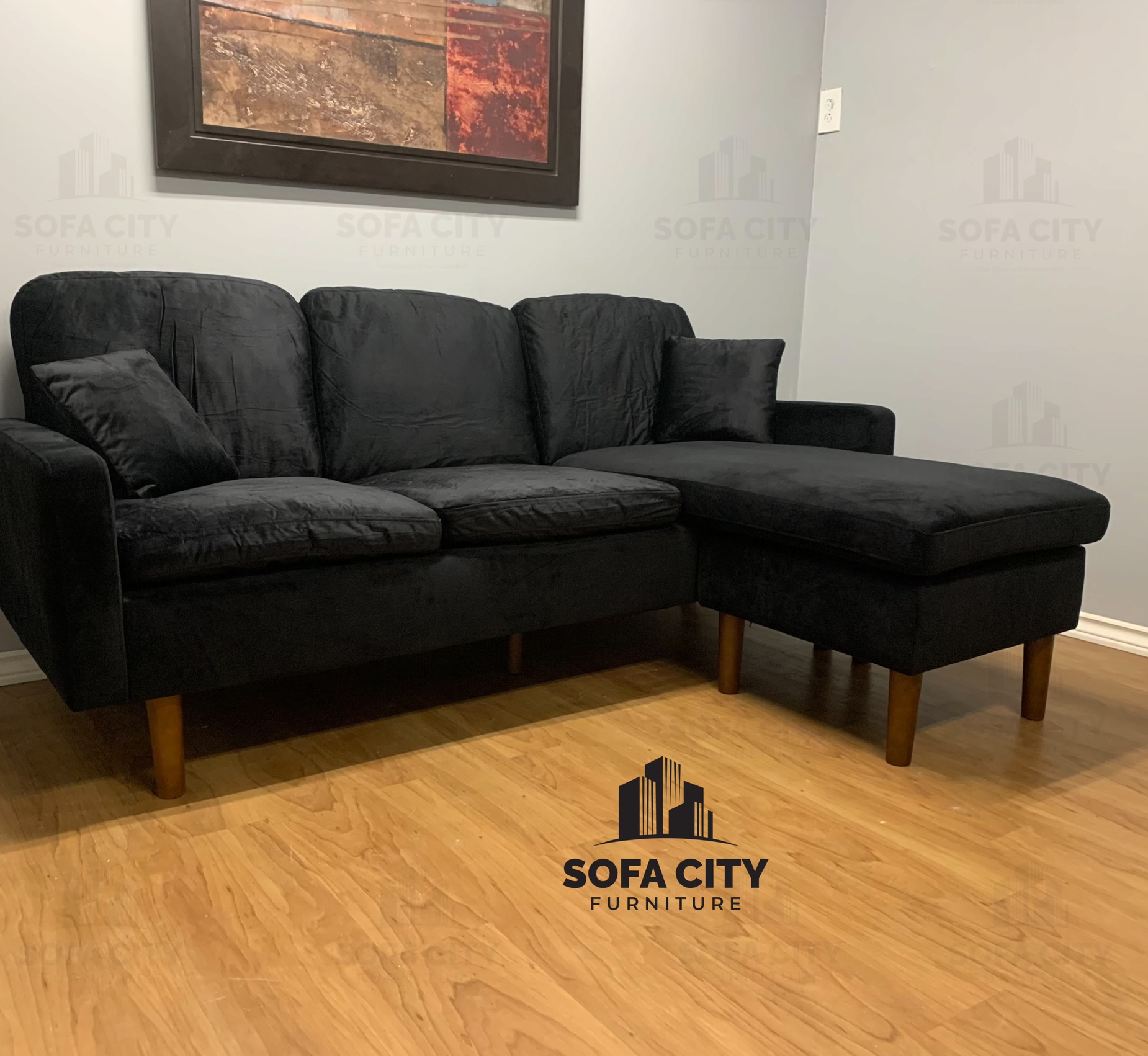 This brand new black velvet sectional is a fantastic addition to any home in need of a compact seating area. Excellent option for individuals in small condos, students, or anyone who needs to fill a small seating area in their home, for an affordable price. Please contact for more information, and see the measurements below!