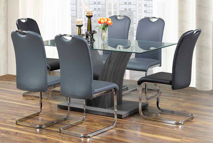 5 piece dining set with clear tempered glass on top of a sleek V design. The modern style chairs consist of PU leather back and seat, and chrome legs